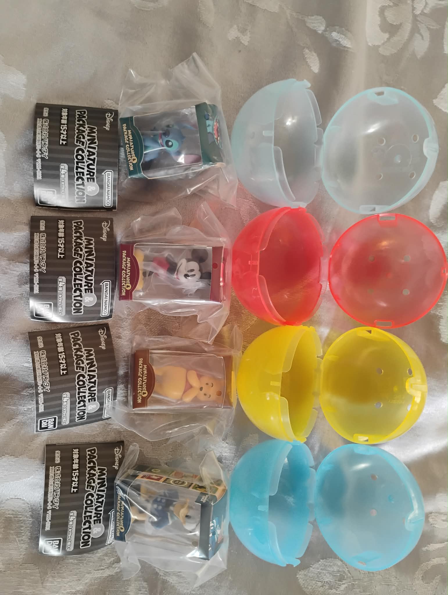Le set complet de 4 figurines Mickey, Donald, Winnie L’ourson et Stich, les gacha sont neuf, avec capsules et étiquettes.